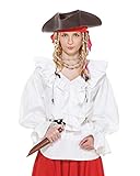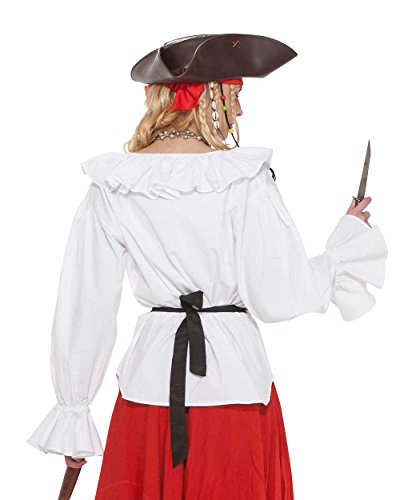 Lady pirates bring a special kind of mayhem and disorder to the seas. Let your femme fatale flag fly with this 100% cotton blouse in bright colors. Elasticized ruffles adorn the wrists, collarline and front center. They somehow soften the sinister plans you might be up to!