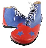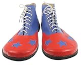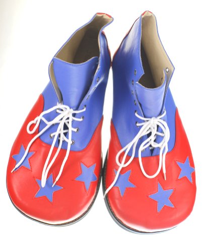 These large, red and blue clown shoes are about 6.5″ wide, at their widest spot, and 14″ long. They are made of imitation-leather with a light, foam sole. The shoes feature three stars around the toes. The shoes are men’s size 52, but will fit most adults.
