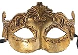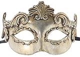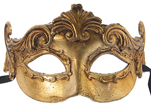 This Greek-inspired costume mask is made of paper mache, and hand-painted. It is about 7″ wide and 4 1/2″ tall. The mask will make a great Halloween costume accessory.