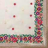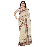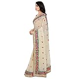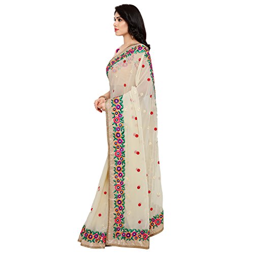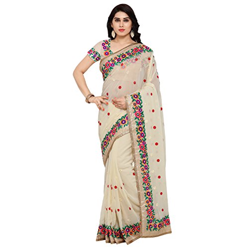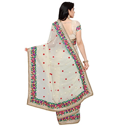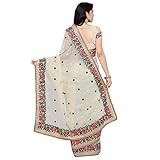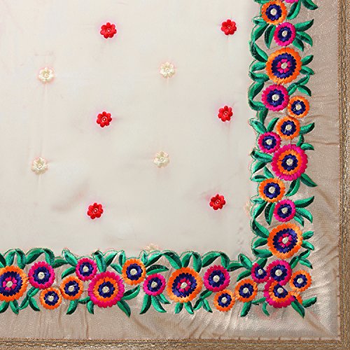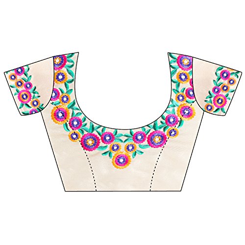 This beautiful saree features colorful floral embroidery on the border of the saree and small motifs in every single place the saree. The blouse attached also has floral embroidery work