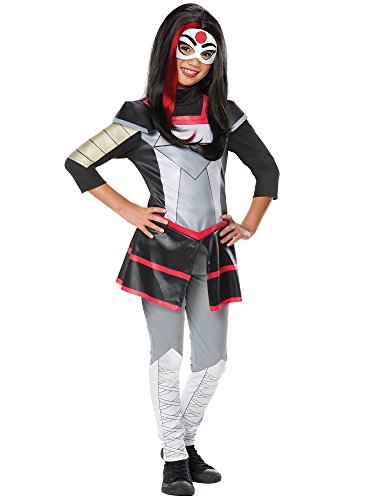 Dress the part of a fierce warrior in our DC Superhero Girls Katana Deluxe Costume for Halloween. She is one of the most artistic students at Super Hero High as well is a highly skilled sword expert. This samurai inspired costume comes complete with a gray, black, and red top that’s designed to look like the armor of a samurai, with a princess waistline tapering into a split black skirt trimmed with red. Also included are a pair of gray leggings with light gray calves patterned to look as though they are laced-up boots. The costume is finished with Katana’s unique mask, which covers the forehead and the eyes, is white lined with black around the edge of the mask as the eyes, and features a red circle in the middle of the forehead and bold black cartoon eyebrows. Complete the Katana costume with a plastic sword and other heroic accessories.