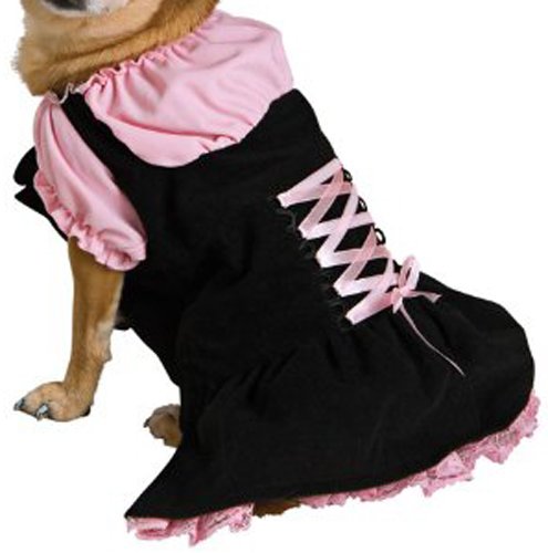 Cute pirate-motif costume with pink top and black dress with faux pink ties on back. Comes with matching black hat with pink pirate insignia and ruffle.