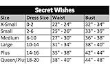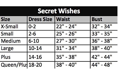 Secret Wishes sizing: XS 0 to 2, Small 4 to 6, Medium 8 to 10, and Large 10 to 12