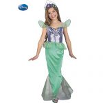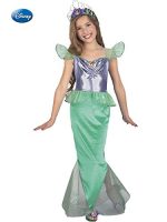 Does the Disney movie Little Mermaid warm your child’s heart every time she watches it? Then she’ll love the Kid’s Standard Ariel Little Mermaid Costume, which features a one piece dress and a matching tiara. The dress is short sleeves and an ankle length hemline. The midsection of the dress is cut from a purple stretch vinyl material and features a small picture of Ariel at the center of its neckline. The sheer green sleeves are trimmed to match the trim around the neckline. The skirt falls to the floor in a shimmer green knit, and the tiara is purple.