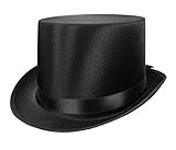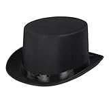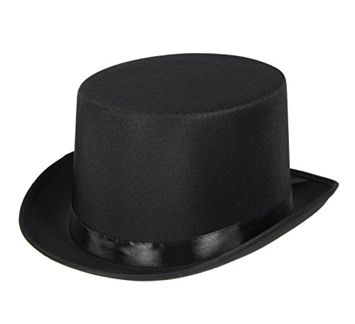 Black Satin Top Hat from Nicky Bigs Novelties TM This Black Top hat is a brilliant economically priced and economy quality item. This hat has many uses and will fit adults and a few children. The inner has a measurement of approximately 22.5″ in circumference. The inside meausres approximately 6-5/8 inches back and forth and 8 inches from front to back. The full height of this hat is approximately 4.5 inches tall. The remainder of the exterior is approximately 11.5 inches long and 9 inches wide. The brim will extend approximately 1.75 inches off the back and front of the hat, and 1-3/8 inches off the edges. The hat band measures approximately 5/8 inches tall and cross over itself within the rear of the hat leaving 2 tails for a elegant look. Designed for ages 14 and up. Keep Away from Fire.