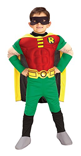 Muscle chest jumpsuit with boot tops, cape, belt and eyemask. Toddler fits size 2-4.