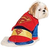 The ultimate costume for your superdog! Blue costume with traditional logos in rhinestone detail on the cape and also on the glittery gold belt.