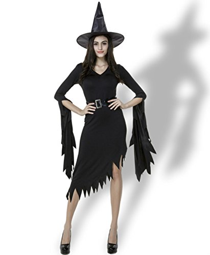 Glamorous witch costume featuring pointed hat with decorative buckle and long-sleeve dress with contrast sash and standing collar.