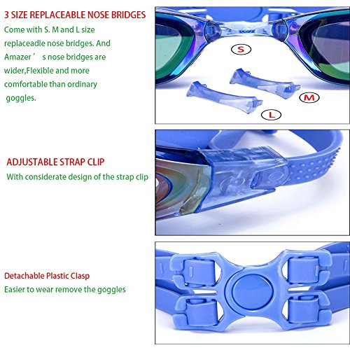 - COMFORTABLE WEARING – Advanced environmental protection flexible silicone frame. According to the design of 3D human engineering, let the eyes sticks to eye frame more comfortable. Completely sealed silicone protective circle design to prevent water from entering your swimming goggles. This is a feature of our swiming goggles – KEEP WATER OUT. Elasticity nose pieces, Comfortable to wear. Improved nose piece provide extreme comfort that never hurt your nose or leave a mark on your face.