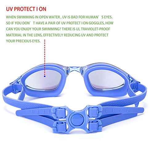- 100% UV PROTECTION, ANTI-FOG COATING, ANTI-SHATTER LENSES, MIRROR COATED LENSES – The coated lens using high quality imported PC material can anti-shatter. The lenses are covered with a layer of anti fog coating effective UV protection and protect your eyes from heat and damage of the sunrays, make your vision clearer especially when you swim outdoors. The uv protection swimming goggles to bring you top uv protection. No longer have to worry about the child’s eyes will be burned in the hot sun.
