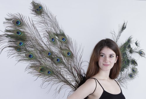 Peacock wing made with natural peacock eyes. they are sized at 35 x 60″. this product is part of our wings, halos category.