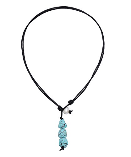 Yunhan Natural Turquoise Pendant Necklace with Cultured Freshwater Pearl Leather Cord Jewelry for Women 18”
