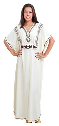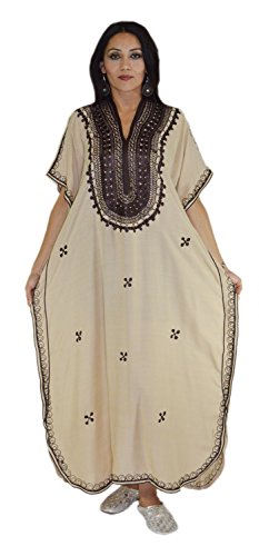 Moroccan Caftan Hand Made Top Quality Breathable Cotton with Brown Hand Embroidery Long Lenght Beige
