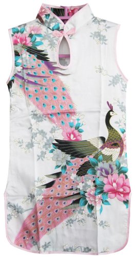 Sunny Fashion Girls Dress White Peacock Artificial Silk Cheongsam