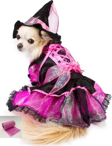 Shiny Pink Witch Costume with Veiled Hat and Bags – For Dogs – Sizes XXS thru XL