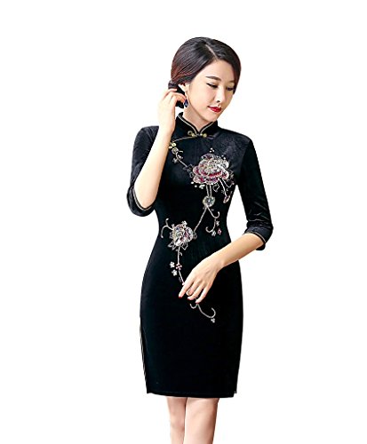 ACVIP Women’s Flower Embroidered Half Sleeve Velvet Evening Chinese Dresses Cheongsam Qipao