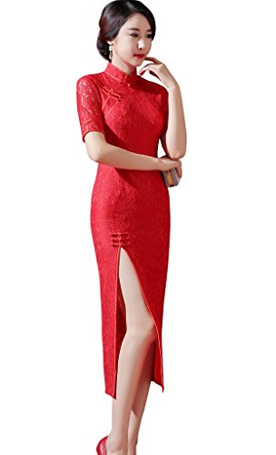 ACVIP Women Flower Lace Half Sleeve Two Side Slits Chinese Dress Qipao Cheongsam Rose Red
