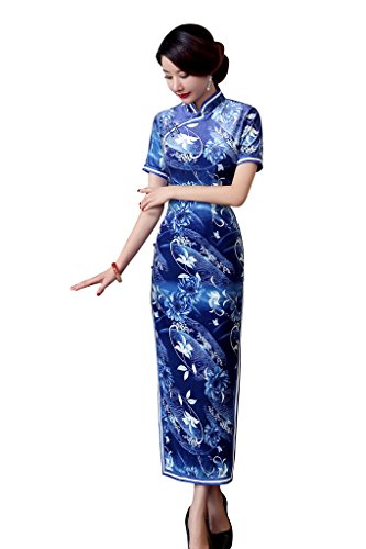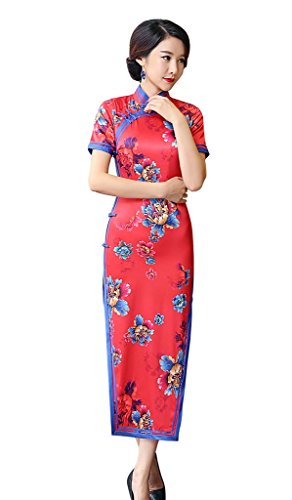 ACVIP Women Flower Printed Satin Short Sleeve Evening Chinese Long Dress