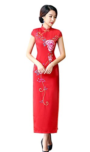ACVIP Women Flower Embroidered Cap Sleeve Chinese Long Red Dress