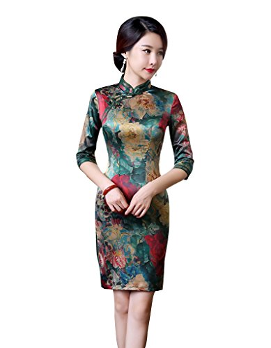 ACVIP Women Flower Printed Chinese Dress Long Cheongsam Green