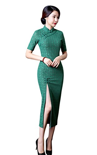 ACVIP Women Rhombus Lace Chinese Green Dress Long Qipao Cheongsam