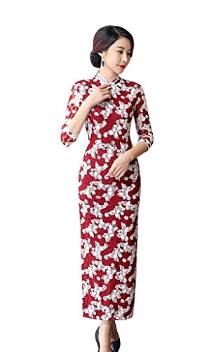 ACVIP Women Butterfly Pattern Lace Evening Chinese Long Dress Qipao Dark Red