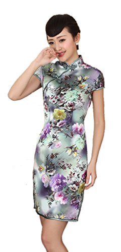 AvaCostume Women’s Silk Vtg Peony Printed Qipao Mini Dress Cheongsam